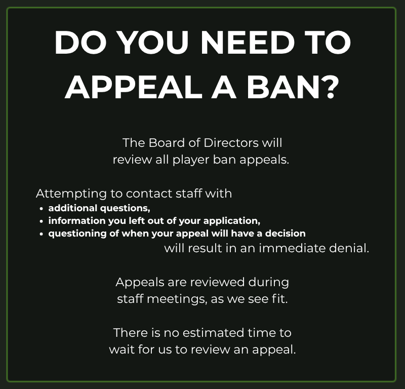 • Yes, you can appeal your ban through our Discord server by filling out an appeal application.